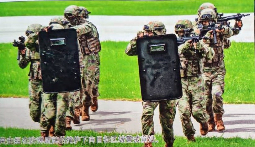 演习中,突击组在防彈盾的掩护下向目标区域警戒前进,士兵手持的枪械均为当今我军最新轻武器。
