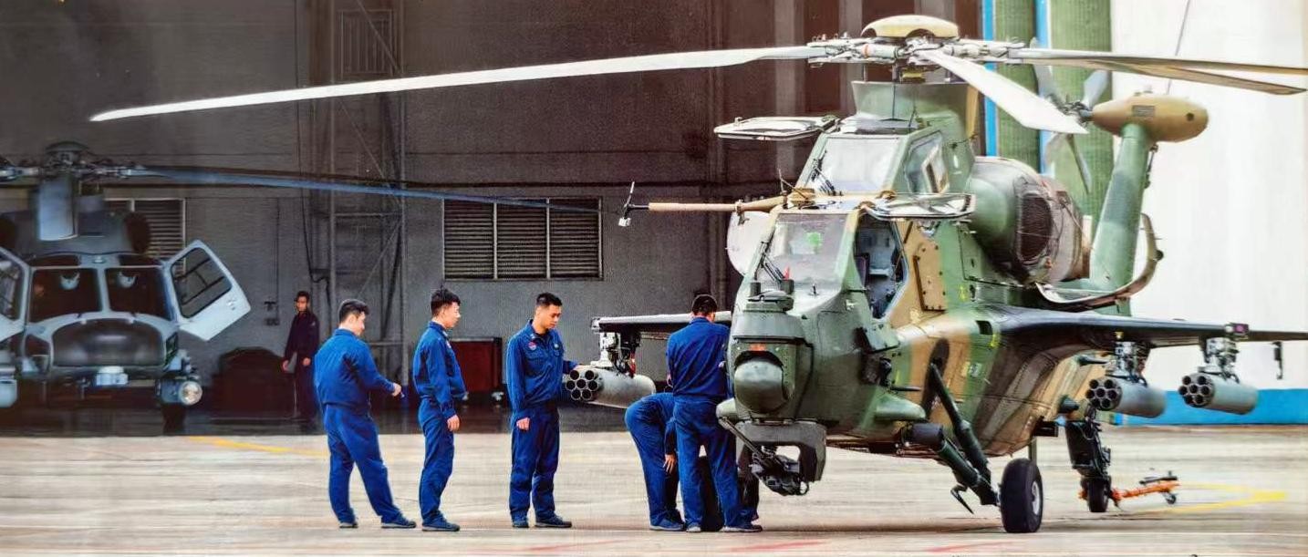 在石岗机场进行维护的驻香港部队空军型武直10直升机与直20直升机,图中武装直升机在短翼挂载了火箭发射巢。
