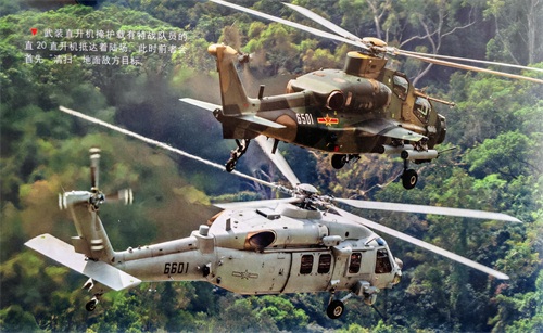 武装直升机掩护载有特战队员的直20直升机抵达着陆场,此时前者会首先“清扫”地面敌方自标。