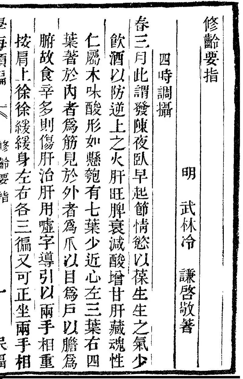 《修龄要指》全书共一卷九篇,分别是四时调摄、起居调摄、延年六宇诀、四季却病歌、长生一十六字妙诀、十六段锦、八段锦导引法、导引却病歌诀、却病八则。四时调摄的理念,源自唐孙思邈真人的《千金要方》之养性篇和《四气摄生图》。