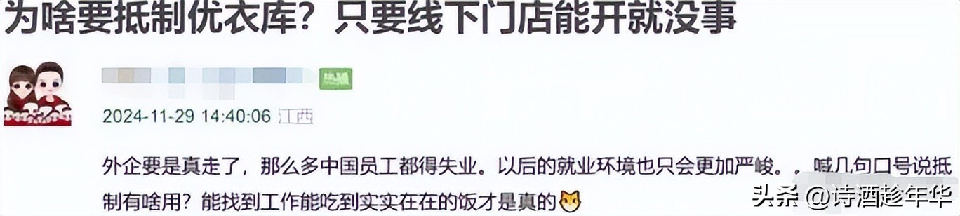有网友提出,如果优衣库真的撤离中国,那可就不仅仅是品牌的损失了——那么多中国员工可能就得失业,失去工作岗位,想想看,这对就业市场来说,简直是雪上加霜啊!就业形势本就不太乐观,万一优衣库真的走了,恐怕会让问题更加复杂。