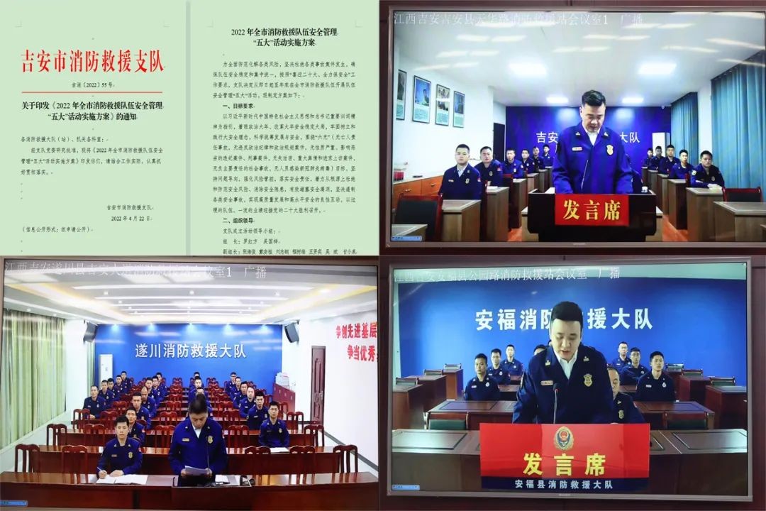 会议组织观看了《全市消防救援队伍日常管理第一季度督查专题片》,就前期队伍管理中出现的问题进行了通报,并解读了《2022年全市消防救援队伍安全管理“五大”活动实施方案》,对重点内容和工作要求进行了明确;吉安县、遂川县、安福县大队就安全建设工作作了表态发言。