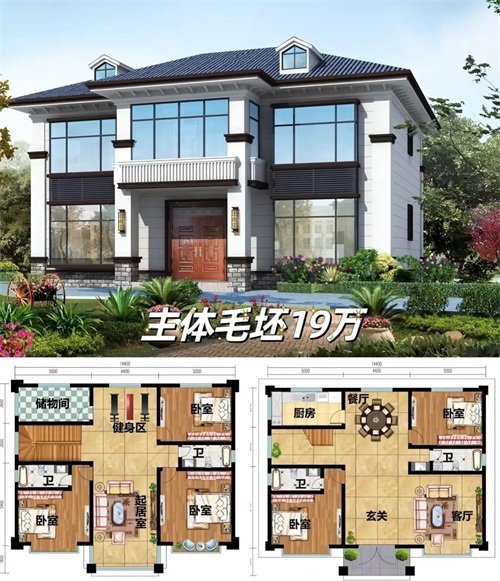 报价:主体白坯19万,硬装28-36万,软装建议25万以内。参数:面宽14.4米,进深12.4米,建筑面积178㎡。一层户型:使用面积170㎡,布置两室两厅一厨两卫一玄关。二层户型:使用面积170㎡,布置三室一厅两卫一健身区一储物。周期:主体毛坯3.5个月,装修6个月。