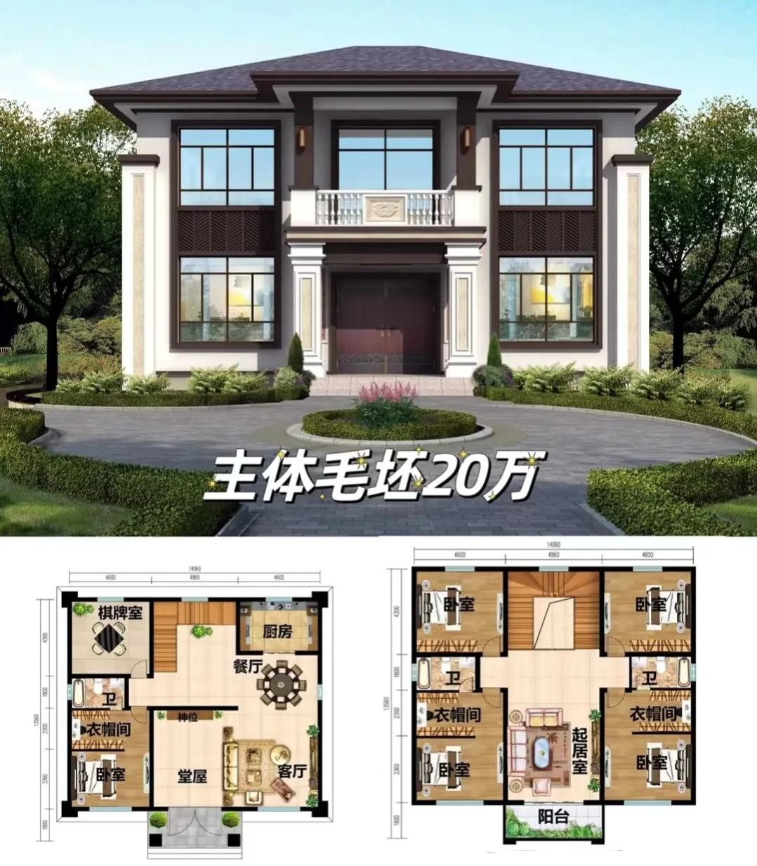 报价:主体白坯20万,硬装30-40万,软装建议30万以内。参数:面宽14.06米,进深13.56米,建筑面积190㎡。一层户型:使用面积190㎡,布置一室两厅一厨一卫一棋牌室一堂屋。二层户型:使用面积196㎡,布置四室一厅两卫两衣帽间,带一个阳台。周期:主体毛坯3.5个月,装修6个月。