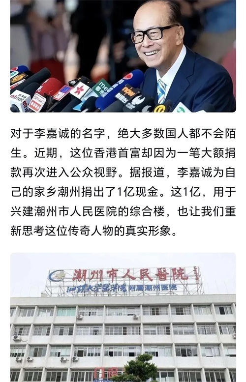 据《香港经济日报》报道,如今96岁高龄的李嘉诚,身家高达348亿美元,稳坐亚洲富豪榜前列。但你别看他现在风光,当年在香港也是从”街边档”开始打拼的。正所谓”穷则独善其身,达则兼济天下”,这些年来,李嘉诚通过李嘉诚基金会为家乡建设累计捐资超过百亿元。潮州市人民医院的那栋大楼,就是他老人家的一片心意。