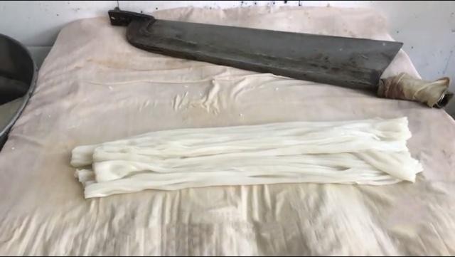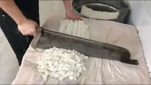 大姐家现在还是坚持所有事情都是人工只做,包括切割凉皮也是,用了30年的凉皮大闸刀,现在还在用,看起来相当有气势