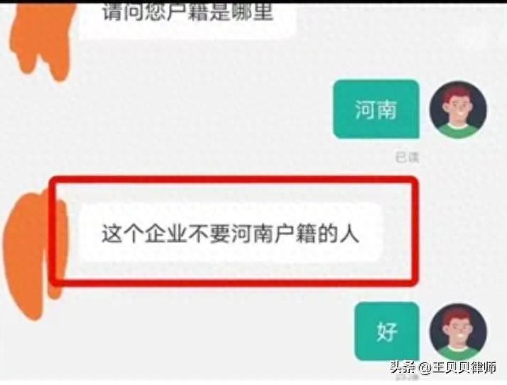 9月7日,河南一90后小伙在BOSS直聘上给猎头公司投简历时,被对方以“企业不要河南户籍的人”回绝。河南人怎么了?该招聘信息是企业经营自主权,还是违反法律规定?