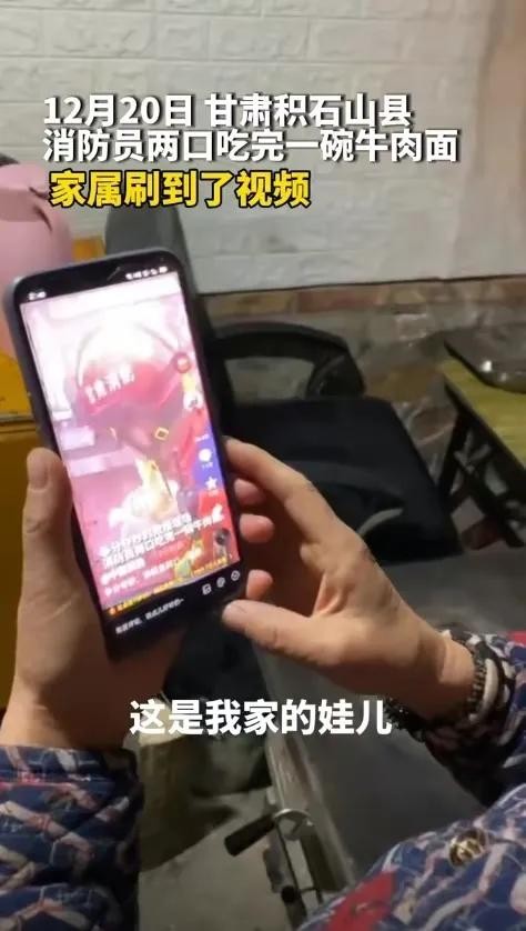 章节三:这段视频很快传到了消防员的家人那里。看到儿子在救援现场吃着简单的牛肉面,家人心疼得直流泪。他们感叹道:“这是我家的娃儿,你看吃的牛肉面,你看口大的,冻得哇,娃娃辛苦了。”