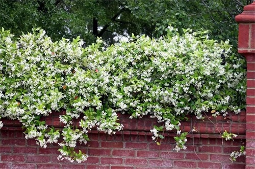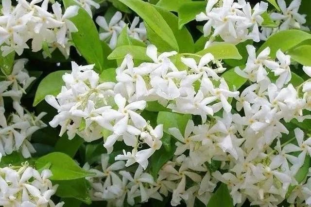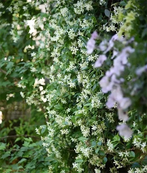风车茉莉学名络石藤,因花似风车香若茉莉而有了这个别称,它是园艺届最重要的花墙植物之一,受欢迎程度非同一般。春夏交替之际是它的花期,每一节成熟枝条都会长出一串花蕾,在盛花时植株上会缀满了成千上万花,花量颇为壮观。
