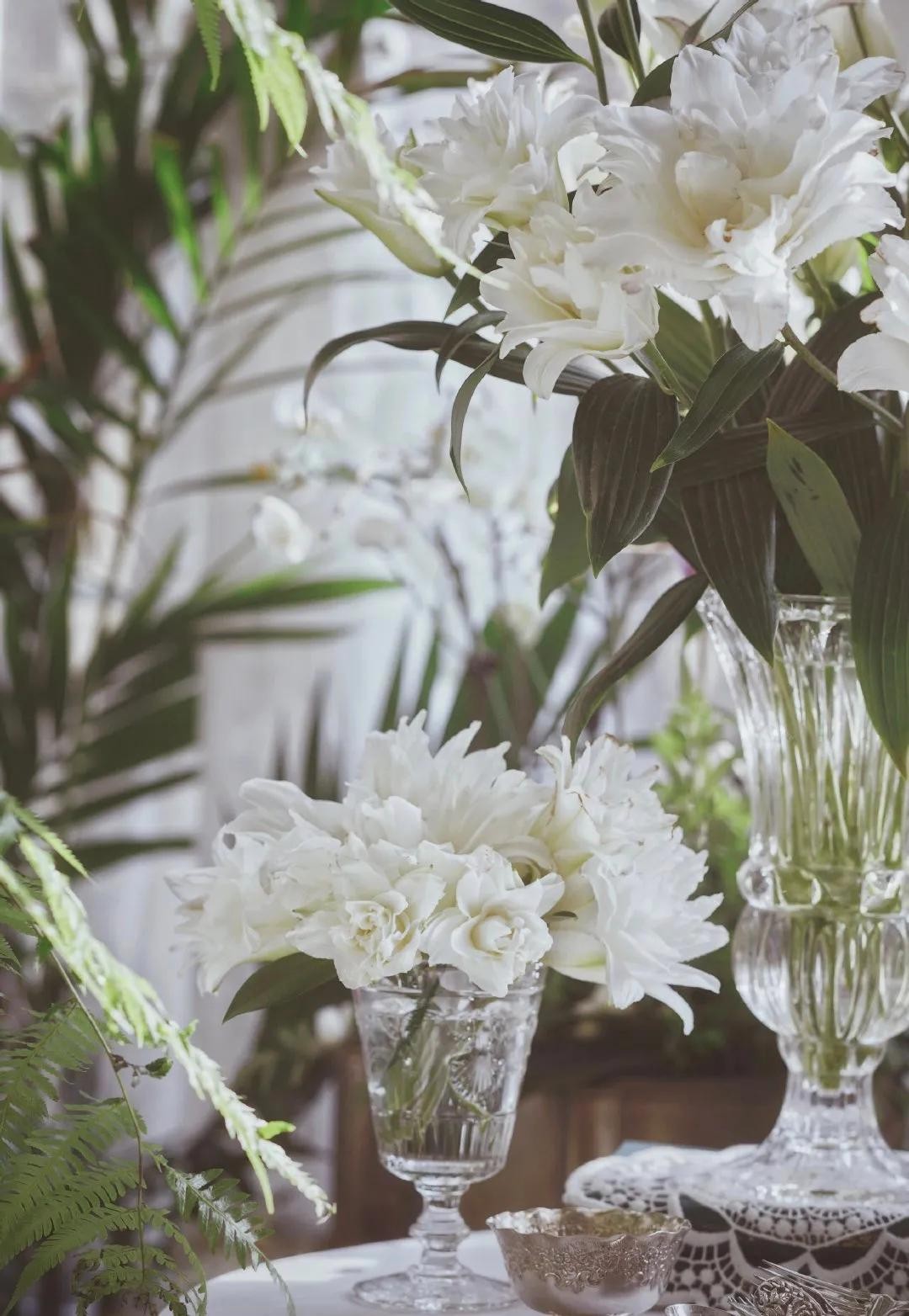 白色的花与绿色的茎叶搭配出来的优雅圣洁