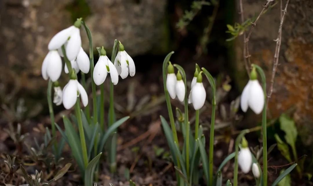 白色的雪滴花开起来就像是一个个下垂的小风铃一样。白色的小花倒挂在枝条上,淡雅清新~