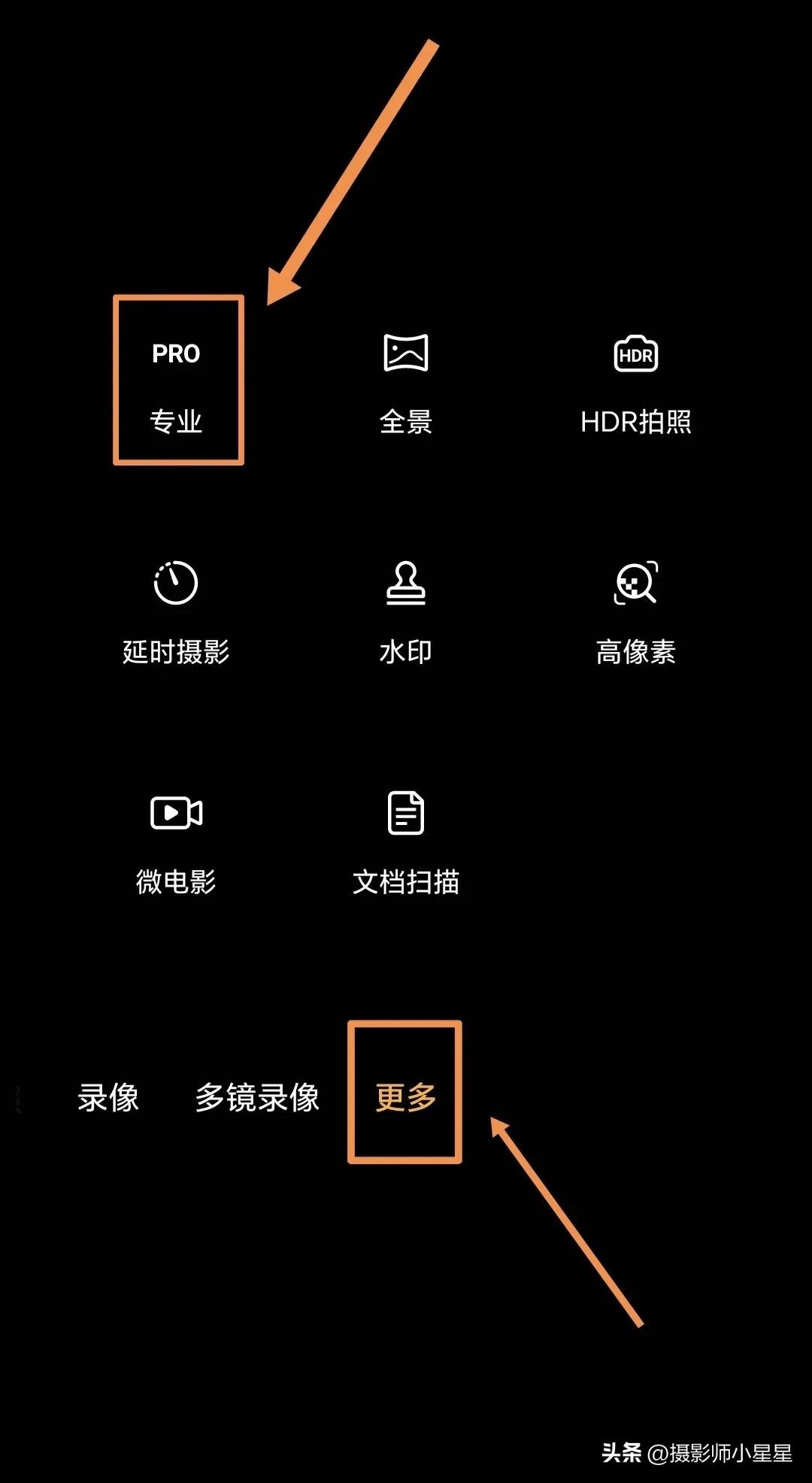 在利用手机进行星空摄影时,正确的参数设置至关重要。我们打开手机相机里的【更多】,找到【专业模式】,就可以调节各种参数。