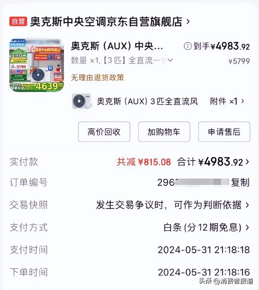 与张女士情况类似的还有消费者苏先生,他遇到的是奥克斯中央空调自动开机的问题。据他讲述,空调安装调试完毕后偶然会出现自动开机的情况。