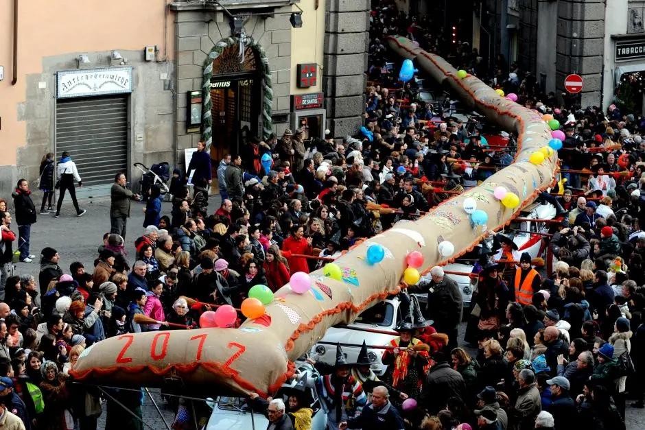 比如2012年的意大利主显节游行中,人们制造了一个长52米的巨型的长筒袜,装满了礼物和糖果,在节日当天被人们合力托起前行,万人空巷,熙熙攘攘,好不热闹。