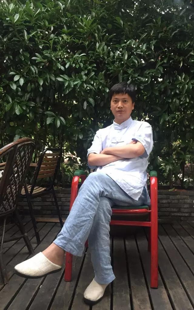 他穿着青衫,短袖,中式复古扣子,一副习武人士打扮。与生人见面时,递上的名片制作成“武林秘籍”的样子。