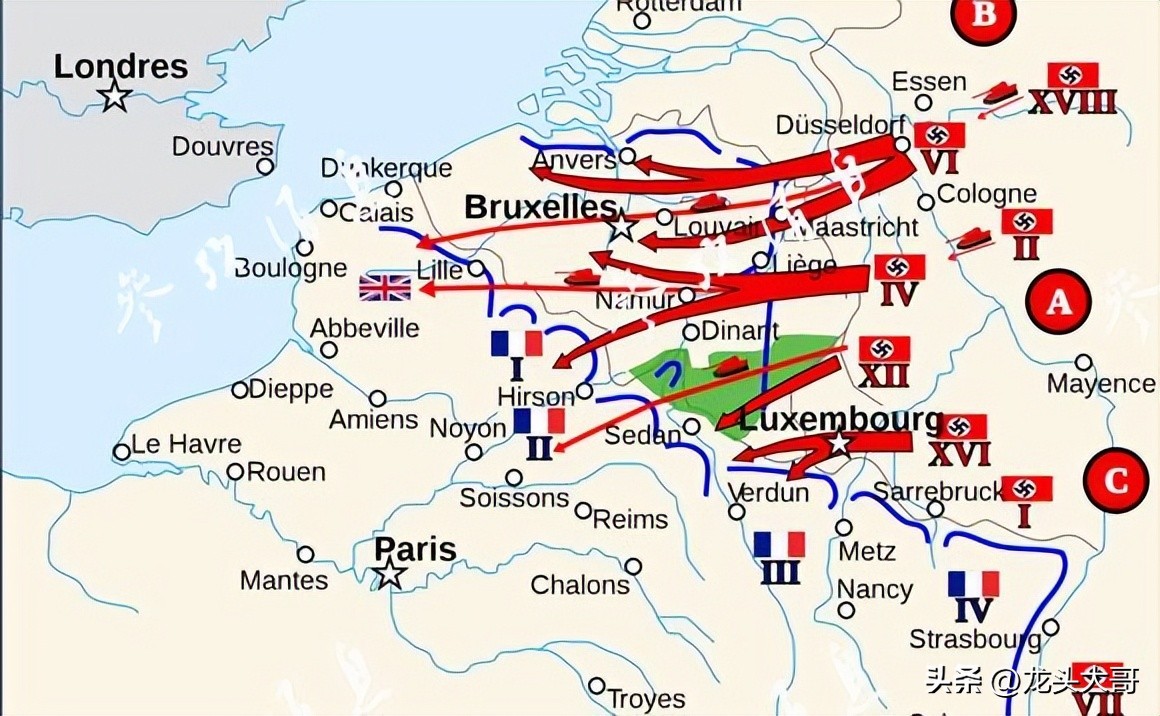盟军把比利时作为预设的主战场,主力部署在法比边境和法国的北部,五国同盟共同抵挡德军的突击,剩下的部队大部分部署在东侧,依托坚固的马奇诺防线,抵挡德军的正面进攻,中部依靠阿登森林和马斯河天堑,特别是阿登森林,林木茂密,道路崎岖,大部队和重装备根本没有办法通过。这里只有比利时2个师和法军9个师驻守,而且都是战斗力很弱的二线部队,从双方的兵力部署来看,就能看出德军用最强的A集团军群,攻击盟军最弱的中部防线,尚未开打,胜负已分。