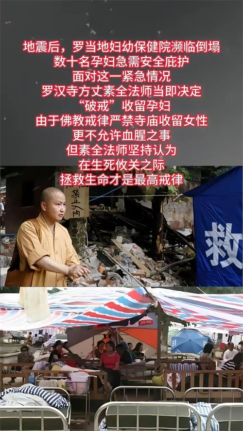 2008年汶川大地震后,由于当地妇幼保健院濒临坍塌,数十名孕妇急需一个容身之所,由于情况紧急,罗汉寺的方丈素全法师当即觉得腾出地方安置这些孕妇。