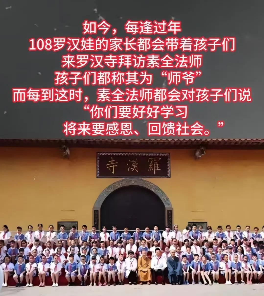 现在每年过年的时候,108罗汉娃就会跟随父母去罗汉寺拜访素全法师,罗汉娃们也尊称素全法师为师爷。师爷每次见到孩子们都会教导他们要好好学习,要懂得感恩,要做一个对社会有贡献的人。