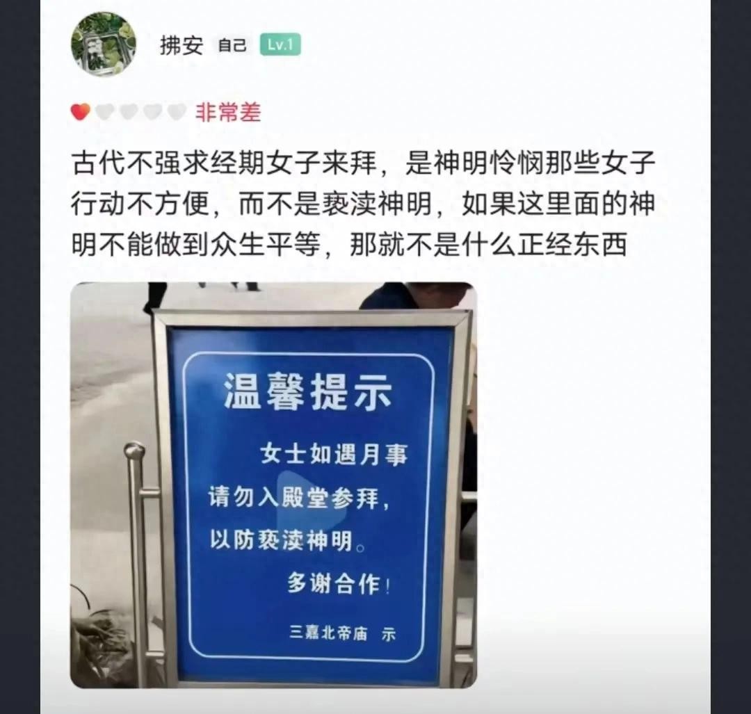 到了这家古庙执行时,却变成了禁忌。佛祖的“众生皆平等”你们是忘了吗,而且如果是尼姑庵的尼姑来经期,难道要把她们赶出去过了经期再回庵堂吗。都什么年代了,这算不算是对经期女性的一种歧视?