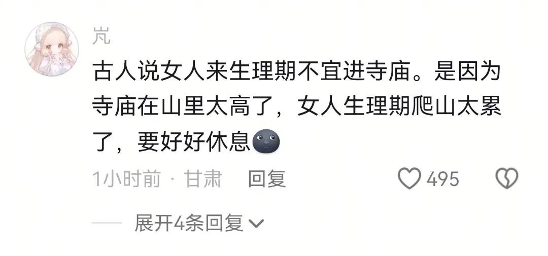 古人说女人来生理期不宜进寺庙。是因为寺庙在山里太高了,女人生理期爬山太累了,要好好休息