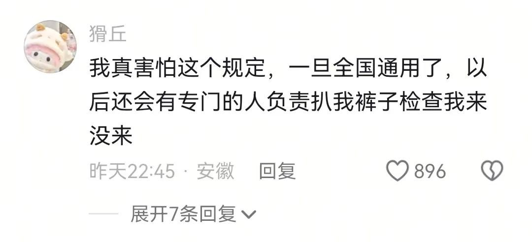 我真害怕这个规定,一旦全国通用了,以后还会有专门的人负责扒我裤子检查我来没来