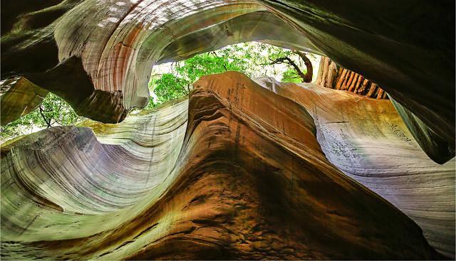 曲直交错,线条圆滑流畅,太阳光的照射下,光影如幻,五彩斑斓,更加迷人。让人惊叹于自然的鬼斧神工,而流连忘返。
