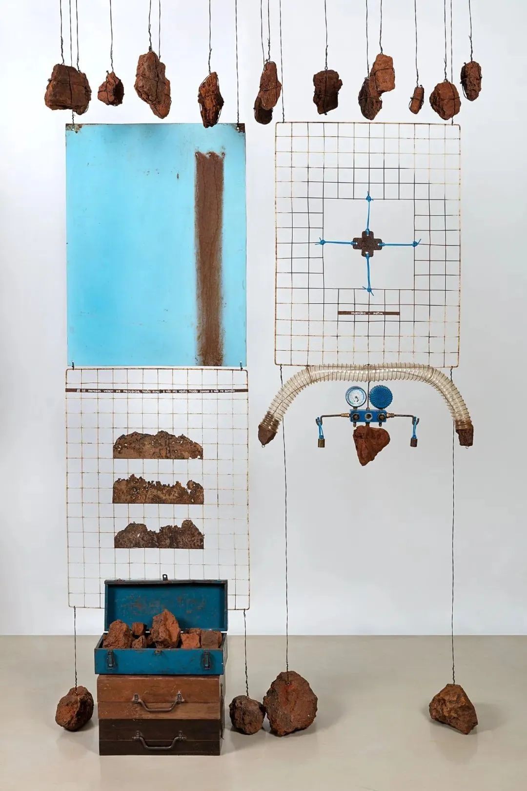 铁、木头、铁矿石、电线、塑料、铜、铁砝码、丙烯颜料和橡胶,400 x 140 x 80 cm。图源:Mendes Wood DM。