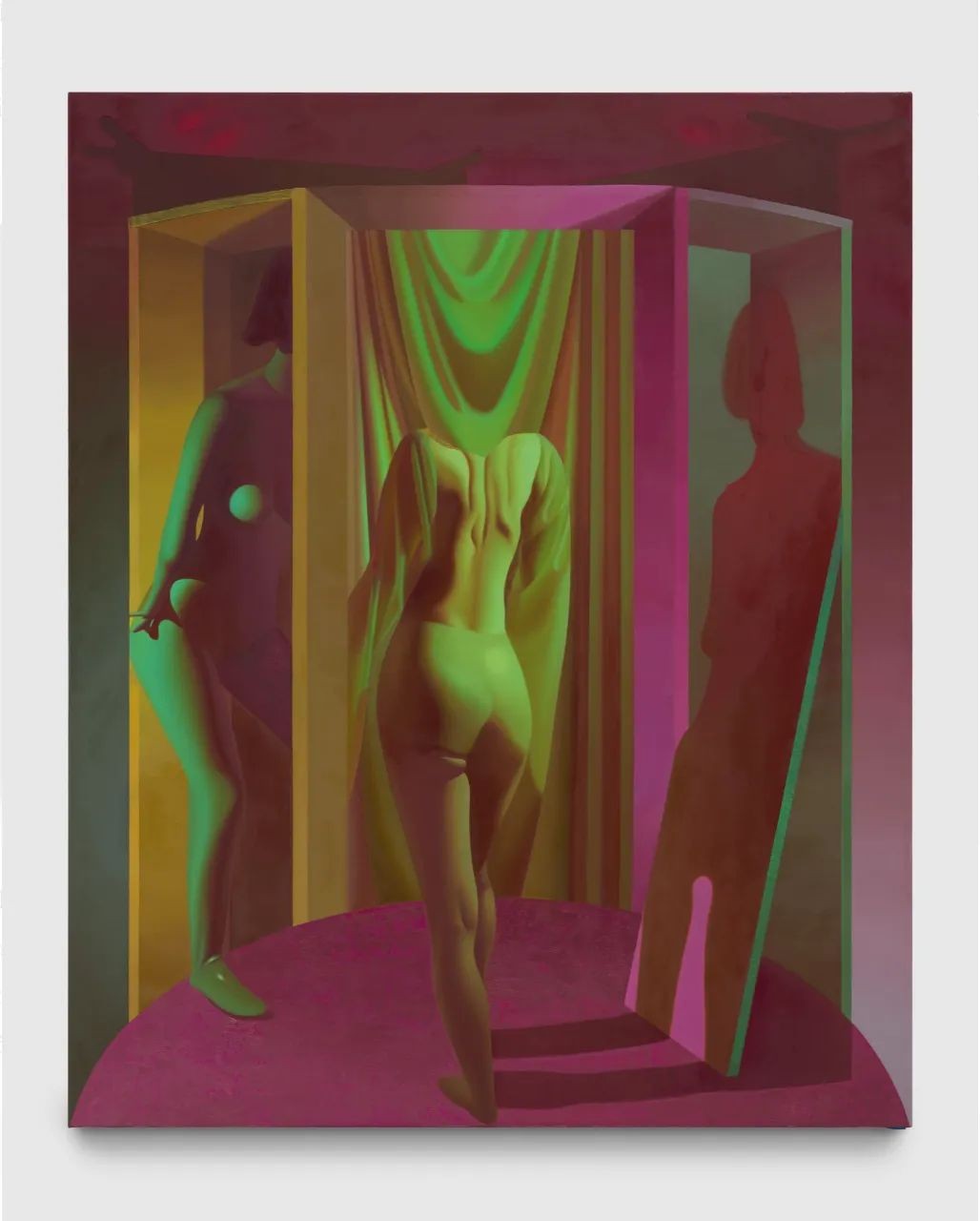迈斯纳的画作中栖居着多种“物种”:由柔软的渐变色调所渲染的理想化女性形态;带有义肢般附属物的、非标准形态且被刻意强调肉感的存在;以及异星般的生物,其光滑完美的表面因带有数字技术的印记而显得尤为诡异。夜总会的VIP包间、医院以及剧院构成了迈斯纳作品的背景——在所有这些场所中,被感知、被监视、被审视都会带来强烈而直观的心理冲击。作品中的具象元素总是若隐若现,并在戏剧性的明暗对照法、变幻莫测的皮肤描绘、非典型的人体构造和神秘难解的动机之下,呈现出一种陌生感。