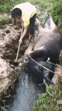 18、这牛是啥情况,怎么躺水沟里不起来了