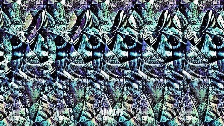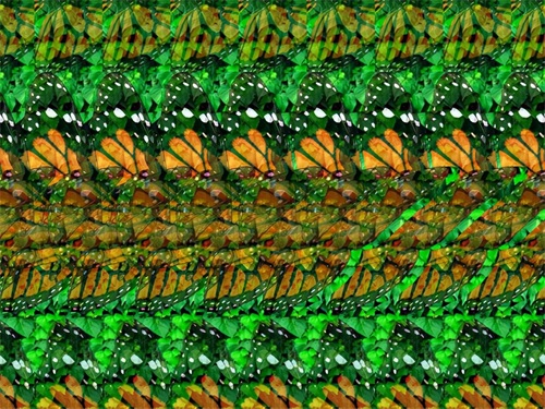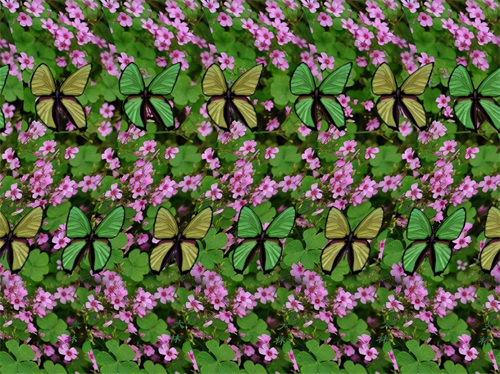 图案1:看看这幅图的花和蝴蝶似乎是在一张纸上面,把眼睛散焦之后你能看到什么?