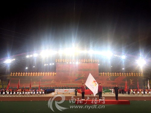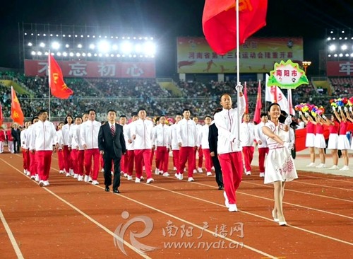 开幕式由热场、入场仪式和文体表演三部分组成。在入场仪式上,南阳市代表团39名运动员和教练员组成的方阵昂首阔步走进会场,他们向观众频频挥手,步伐整齐,展示出南阳体育健儿良好的精神风貌。