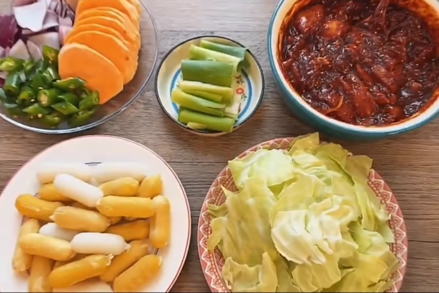 鸡腿 洋葱 土豆 地瓜 年糕 拉面 芝士 蜂蜜 葱 蒜 生抽 老抽 蚝油 料酒 白糖 香油 白胡椒 韩式辣酱 小米辣 卷心菜