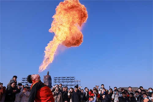 商丘火神台“文化大餐”燃爆春节 非遗肘歌、喷火、舞龙、英歌舞轮番上演