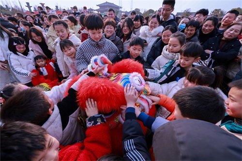 商丘火神台观看舞龙表演的孩子们正在兴高采烈地摸龙头。