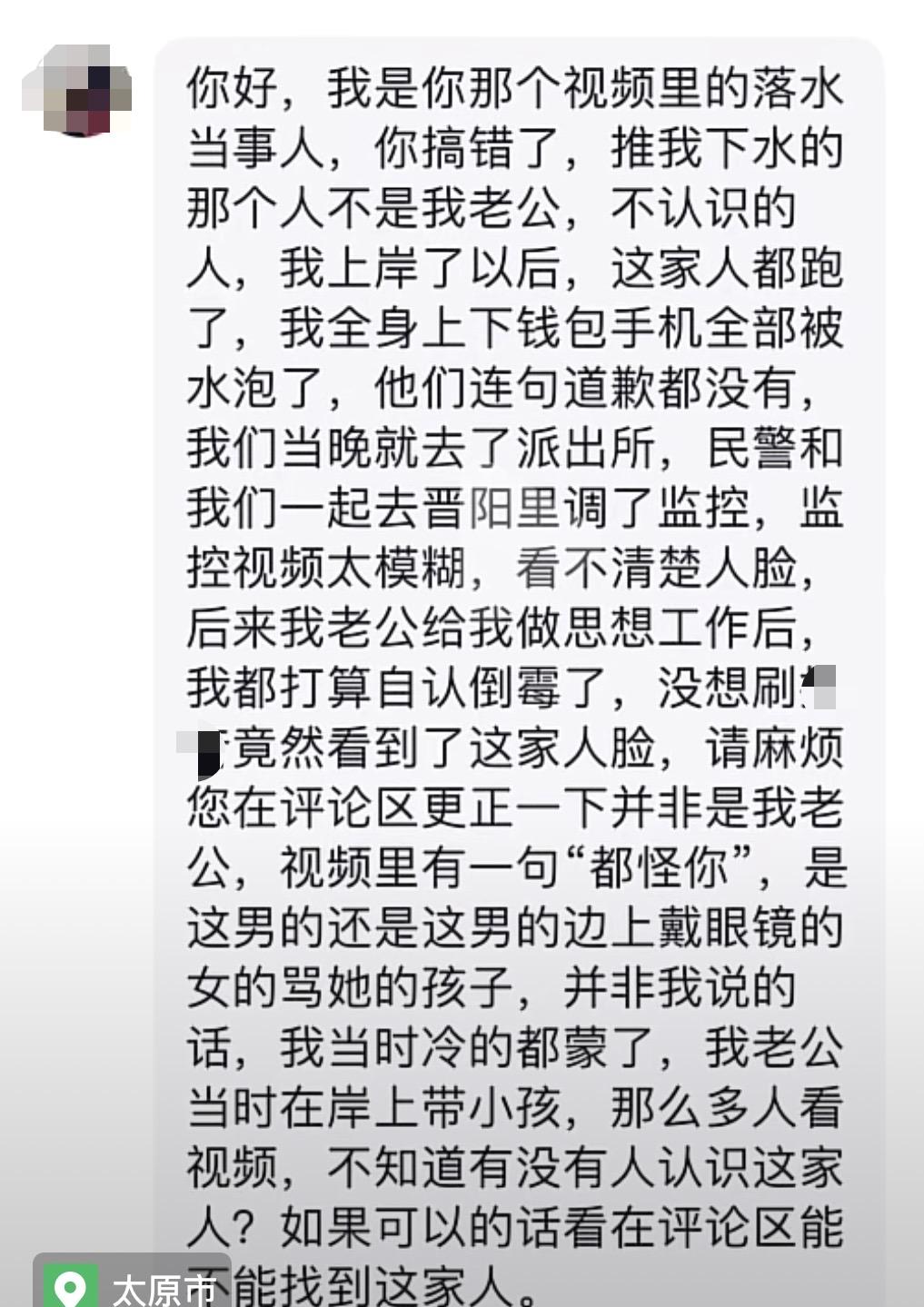 她表示,推她下水的人不是她的老公,两人之间不认识。她的手机、钱包都被水泡了,整个人因为太冷都懵了。然而对方一家却都离开了,连一句道歉都没有。" 我当晚就去报了警,民警和我去晋阳里调了监控,监控太模糊了,看不清人脸。我都打算自认倒霉了。"
