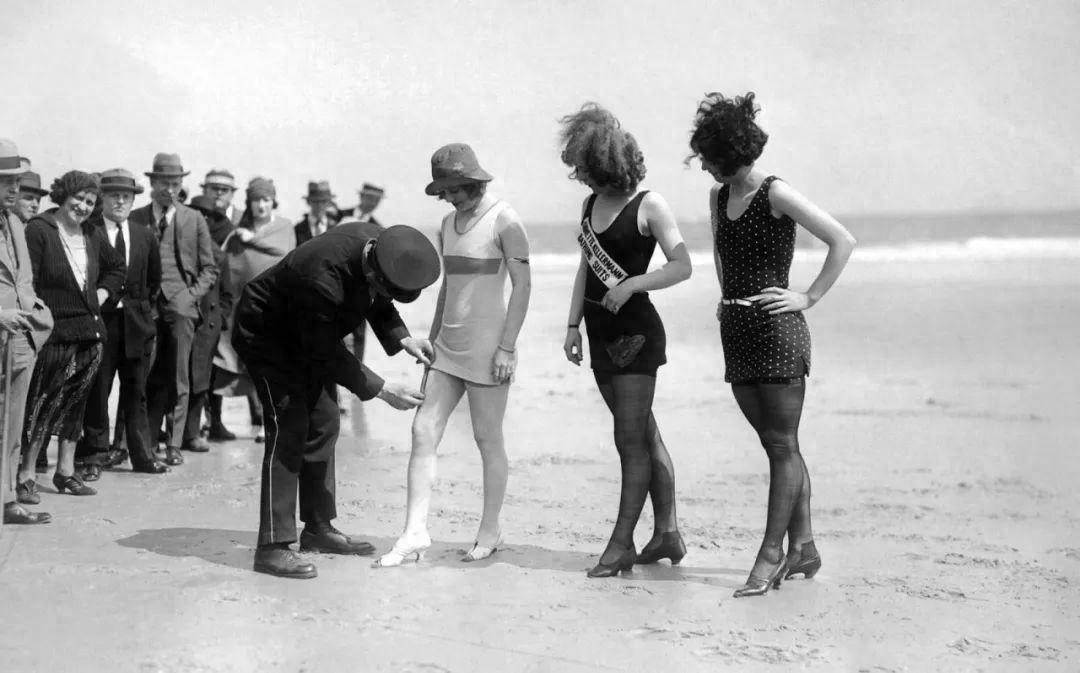 1920年代,美国,一名警察在海滩上测量女性泳装,发现违反规定的妇女要么被要求离开海滩,要么就换套衣服,我十分怀疑这是给当时警察的某种福利…