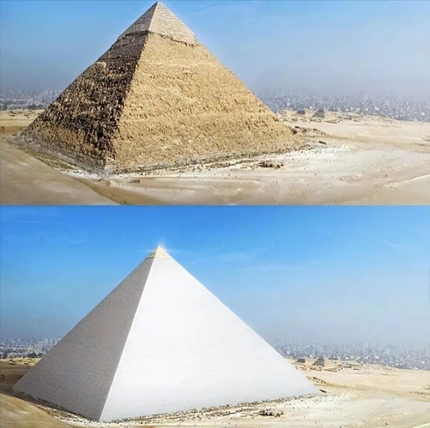 这是金字塔现在和最初的样子对比,建造初期的金字塔的外面是由一层石灰所包裹,而顶部由镀金纸张封顶,由于岁月的侵蚀才变成了现在的模样。