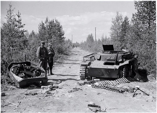 这是一辆被盟军士兵打掉的豹式坦克,可以看到连履带和炮塔掉了,剩下了一脸无辜的德军士兵,而他们则刚刚上完厕所回来。