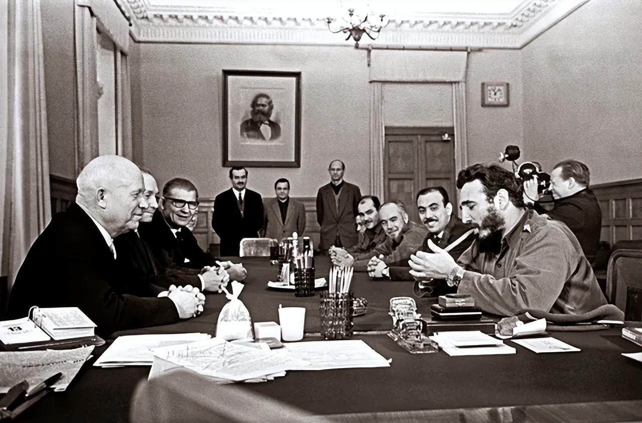 这是1960年代,古巴领导人卡斯特罗在与赫鲁晓夫会面时的景象,卡斯特罗为了提高谈判时的信心,一边抽着雪茄一边交谈。