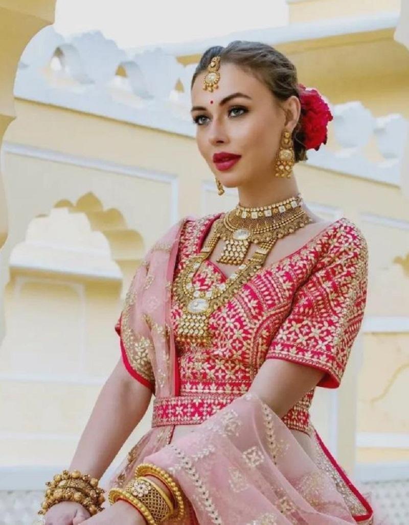 这位身穿印度传统服饰的,其实是一位俄罗斯的著名女模特亚历珊德拉,具有西方面孔的她在东方服饰的加持下,显得格外美丽。