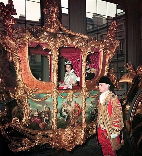 这是英国现任女王伊丽莎白,在年轻时的加冕的画面,可以看到她身着白色礼服,乘坐由黄金制作的马车缓缓驶入,十分惊艳。