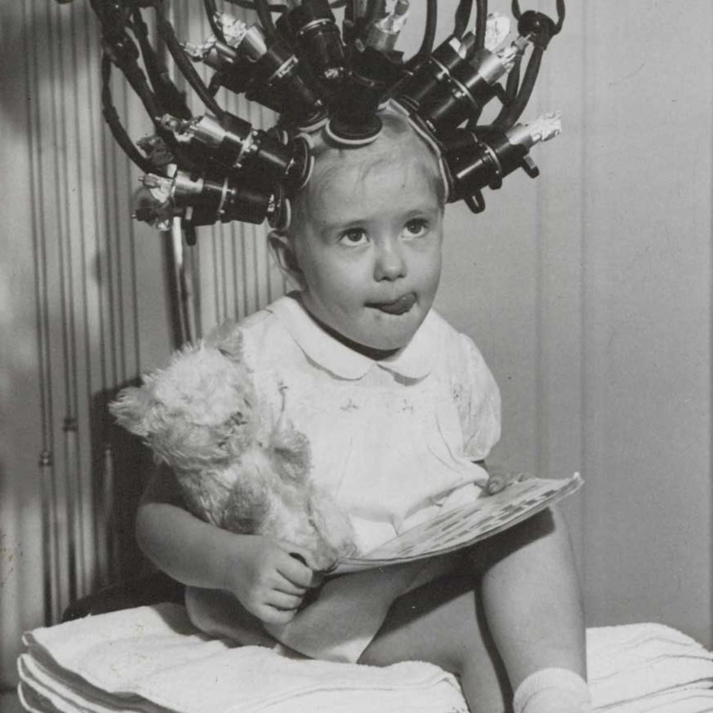 这是一位1938 年时的德国小女孩,而她此时正在一家医院里做卷发,头上戴满了各种奇怪的设备。
