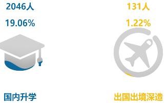 毕业生总体升学人数2177人,升学率为20.29%。其中国内升学2046人,国内升学率为19.06%;出国出境深造131人,出国出境深造率为1.22%。