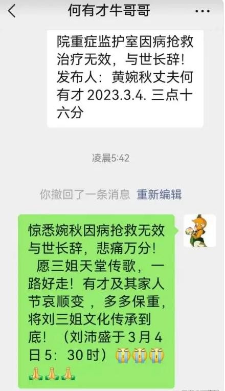 2023年3月4日凌晨3时,丈夫何有才第一时间向亲朋好友发布了通知,黄婉秋在桂林一家医院因病去世。