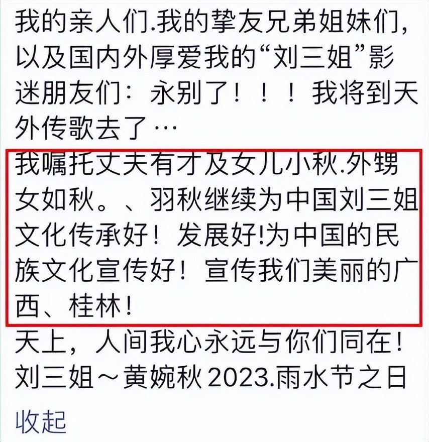 文章中除了和众人告别之外,最让她惦念的还是“刘三姐”的文化传承,重点嘱咐丈夫、女儿、外甥女继承传承,同时希望可以大力宣传广西、桂林。