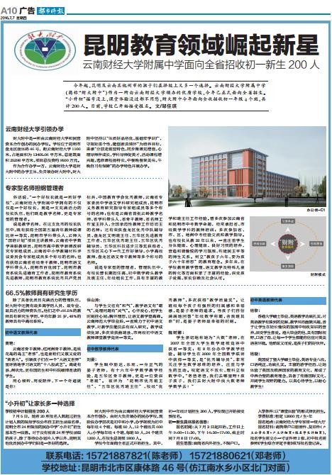 今年起,昆明及云南其他州市的孩子们在择校上又多一个选择。云南财经大学附属中学(简称“财大附中”)作为一所由云南财经大学领办的优质学校,今年已正式面向全省招生。“小升初”摇号没上,课堂体验没过都不用愁,财大附中今年面向全收招收初一年级4个班,共计200人。目前,学校已开始接受报名。