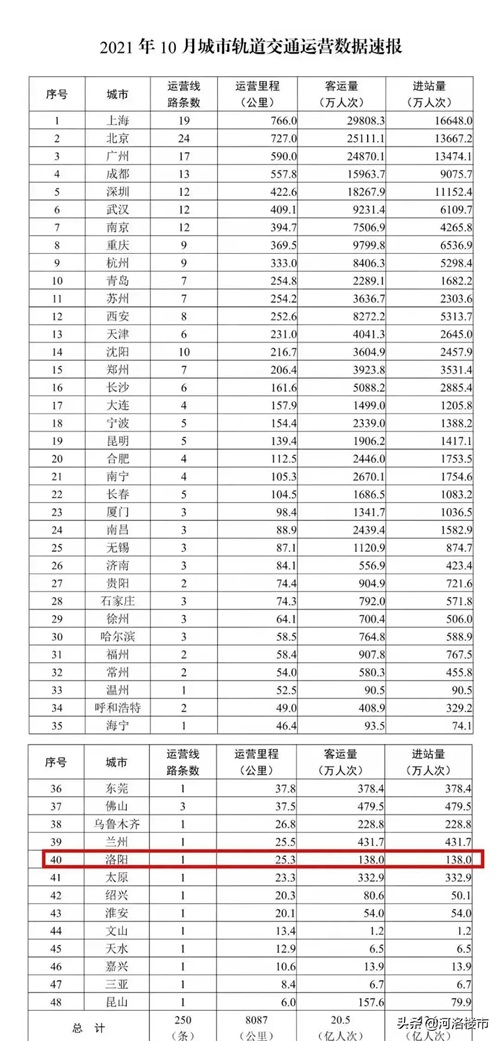 在最新发布的全国地铁10月客流量中显示,当月客运量共计138万人次,每日客流量为4.45万人,客流强度为每日每公里0.17万人。也就是说洛阳地铁月客运量差411万人次,客流强度差0.53。