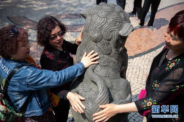 旅客在澳门妈阁庙门前摸石狮子(4月2日摄)。新华社记者张金加摄