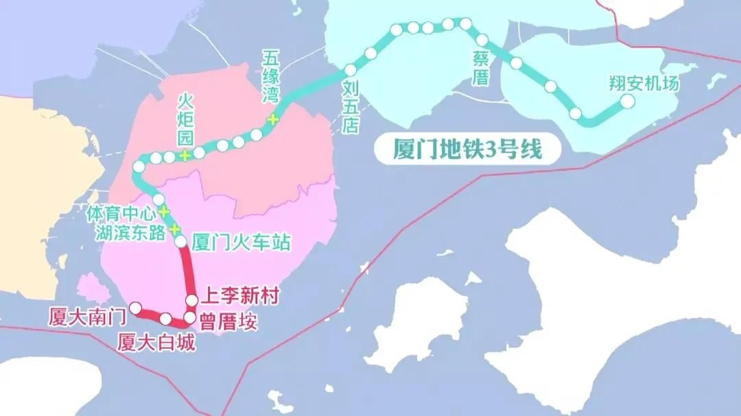 图中我们注意到,厦门地铁四号线也在其中,图中为软件园三期东部至翔安国际机场段,预计与翔安国际机场同步开通。