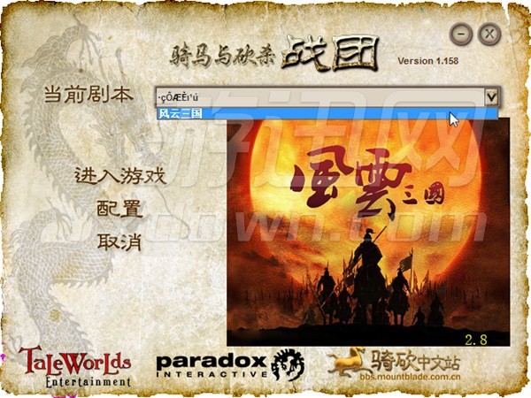 初次运行游戏的玩家请点击当前剧本后面的下拉框,选择“风云三国”,再进入游戏。